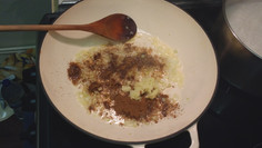 3. Na panvici si opražíme cibuľu do zlata. Pridáme garam masala koreniny alebo karí korenie ak nemáme garam masala, mletý koriander, zázvor a opražíme. Pridáme paradajky z plechovky, paradajkový pretlak, bujón s vodou, med a varíme okolo 15 minút.