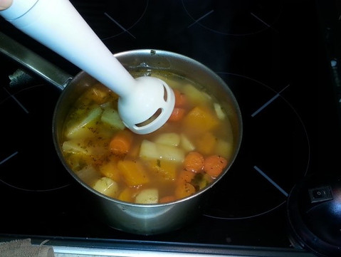 2. Keď bude zelenina dosť poprážená pridáme ostatnú zeleninu do panvice a zalejeme horúcou vodou so zeleninovým bujónom. Necháme povariť prikryté okolo 30 minút, pokiaľ sa zeleninka uvarí do mäkka. Keď bude zelenina uvarená, zmixujeme polievku mixérom na jemňučko.